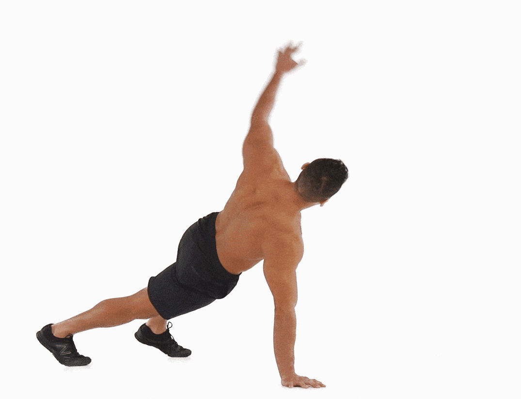 - As you push back up, shift your weight onto one hand and rotate your body, extending the other arm straight up towards the ceiling, forming a "T" shape with your body. Your gaze should follow your raised hand.